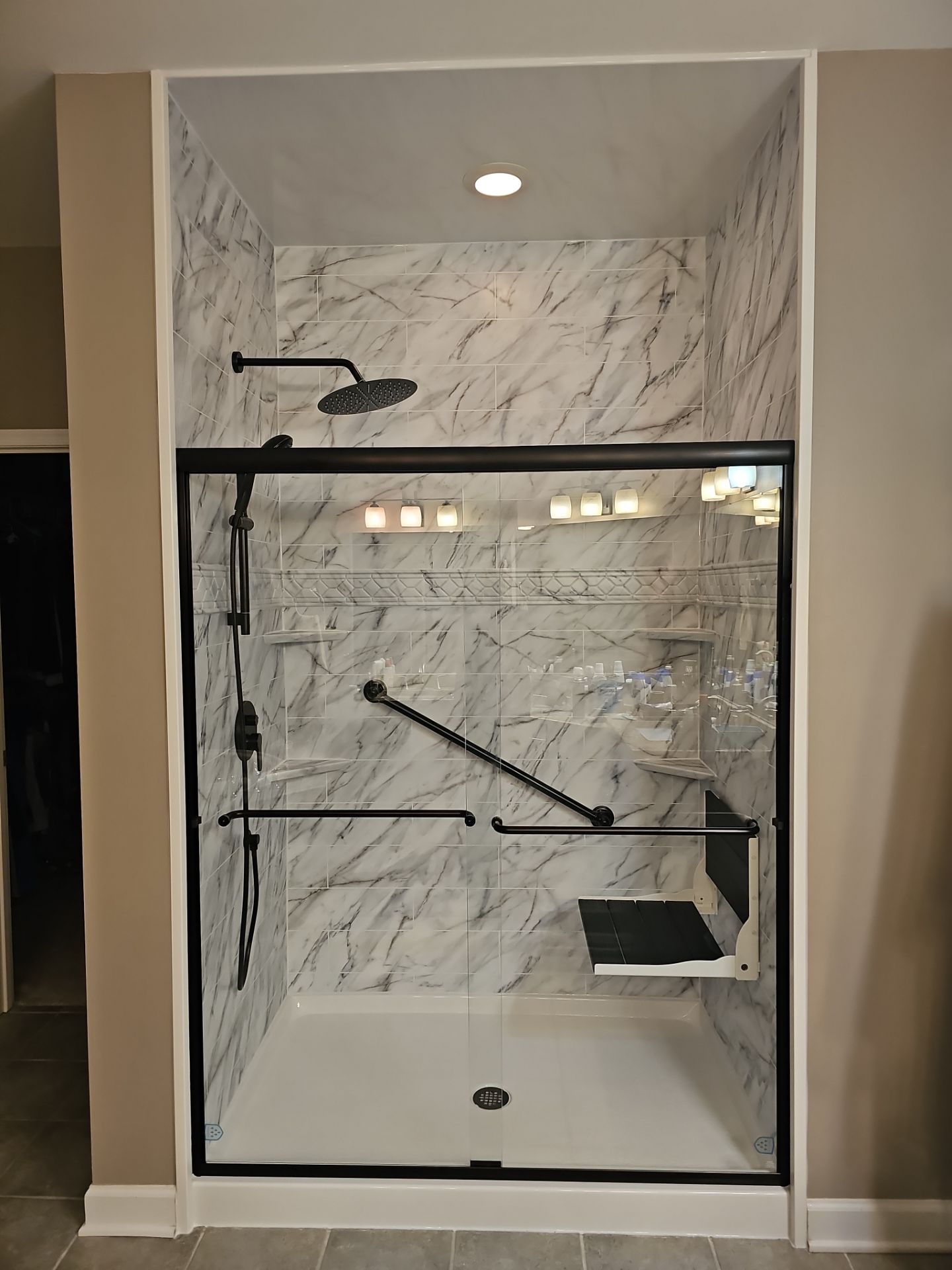 Bath Planet Southwest Virginia transformed this Forest, VA bathroom with a full shower renovation, removing the dated setup and installing a streamlined walk-in design built for easy upkeep and long-term durability. Galena wall panels provide a smooth, grout-free finish, while matte black fixtures, coordinated storage, and carefully selected comfort and safety features come together to deliver a space that feels modern, functional, and dependable for everyday living.