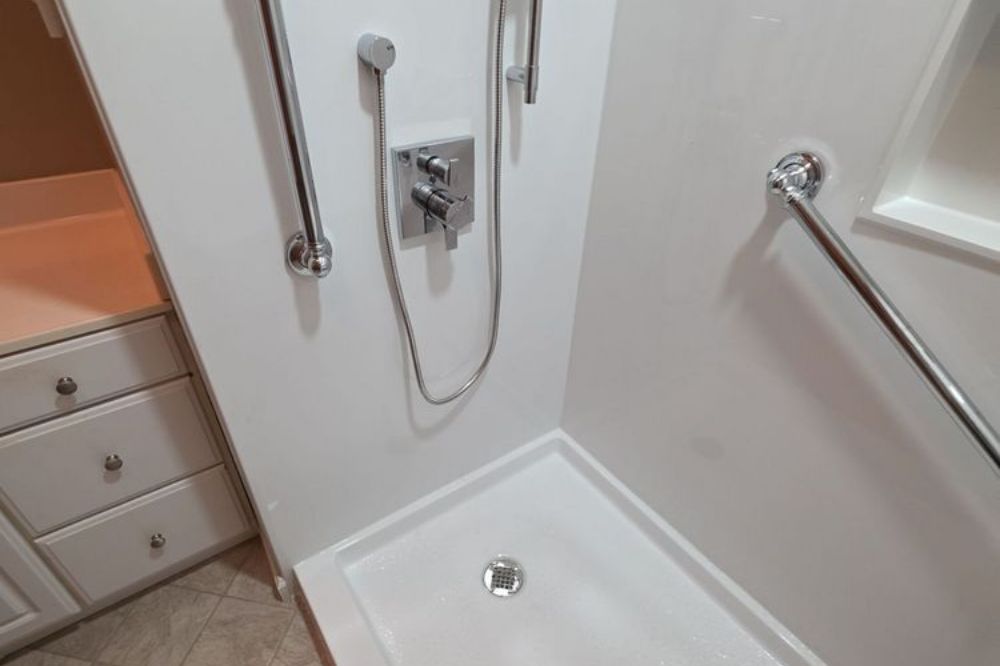 The centerpiece of this bathroom makeover with walk-in shower, flooring & fixtures in Monroe, VA is a beautiful new shower system. We installed a 36×40 white acrylic shower pan with a center drain and left-side plumbing, paired with smooth Travertine acrylic wall panels that extend all the way to the ceiling. The oversized wall and shower pan upgrade ensured a perfect fit and a seamless design. This combination not only looks great, but also offers exceptional durability and easy upkeep.