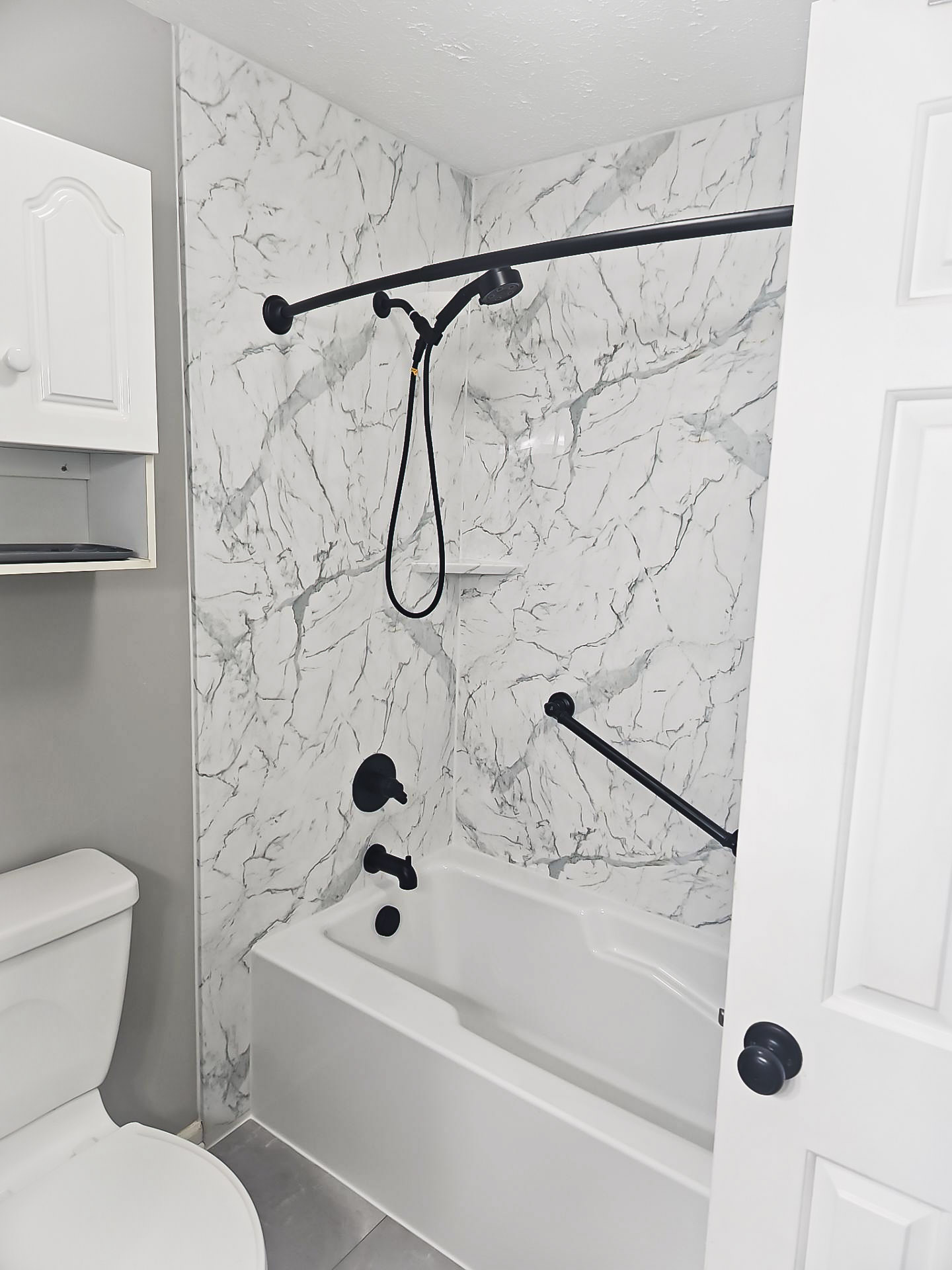 Bath Planet SW Virginia completely reimagined this bathroom to combine elegance, functionality, and safety. From the sleek acrylic Calcutta marble walls to the brand-new tub and color-matched corner shelves, every element was carefully chosen to enhance comfort, accessibility, and modern style, while matte black fixtures and strategically placed grab bars ensure both sophistication and peace of mind.