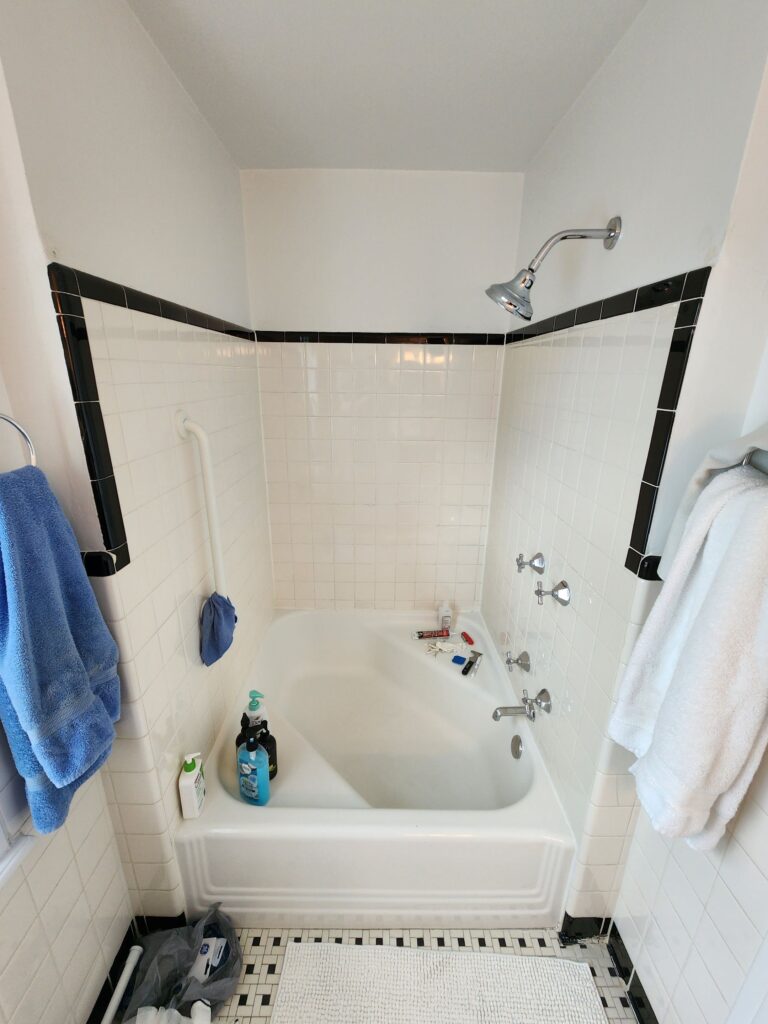 To complete the look, a matte black shower rod was installed, tying together all of the shower’s design elements. This subtle but impactful detail reinforces the room’s cohesive aesthetic and adds to the sophisticated visual flow of the bathroom.