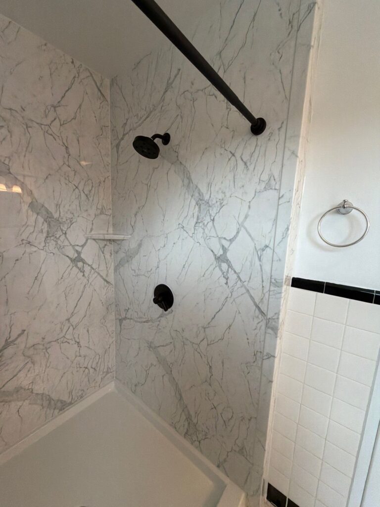 One of the standout features of this Lexington upgrade is how naturally the new oversized shower blends with the rest of the bathroom. The combination of Calcutta acrylic walls and matte black accents creates a rich, high-end look that complements the existing space beautifully. The result is a bathroom that feels polished, intentional, and spa-like—delivering a luxurious vibe the homeowners can enjoy every day.