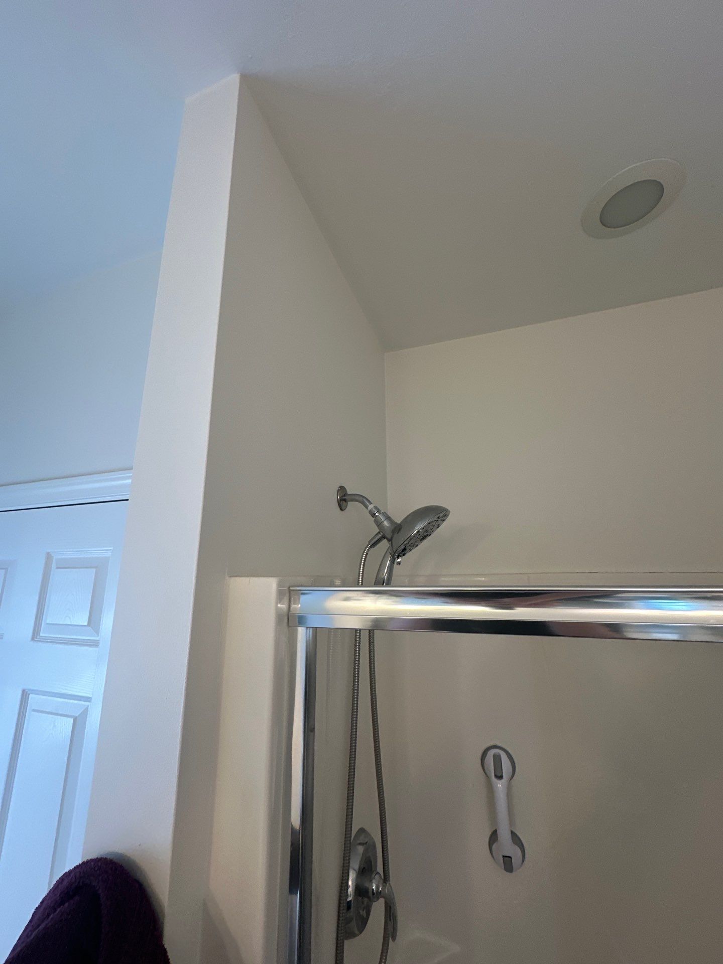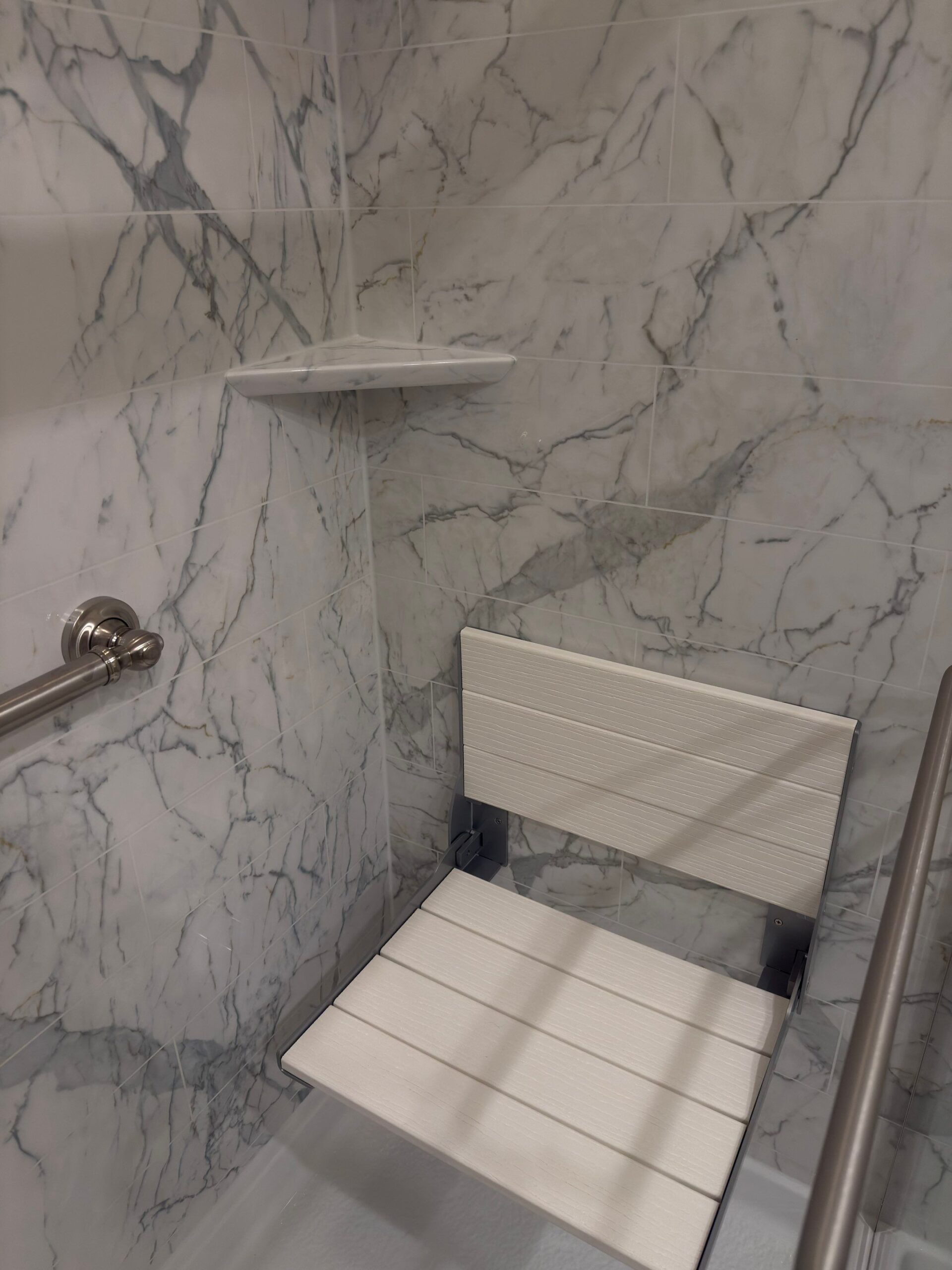 This Salem shower upgrade represents a significant improvement in both form and function. With its striking wall system, coordinated storage, premium fixtures, and thoughtful accessibility features, the space now offers a modern, comfortable, and visually cohesive shower experience.