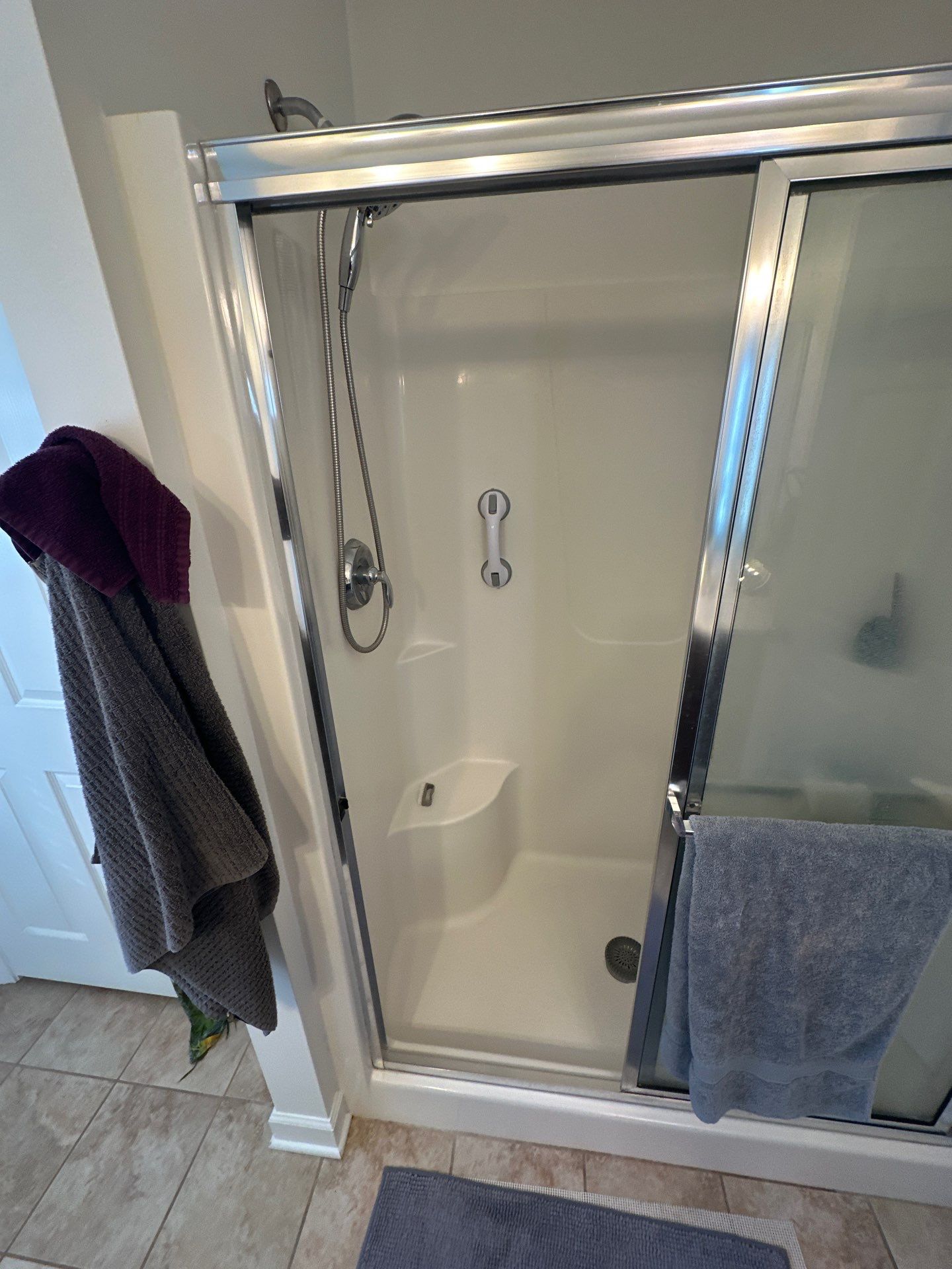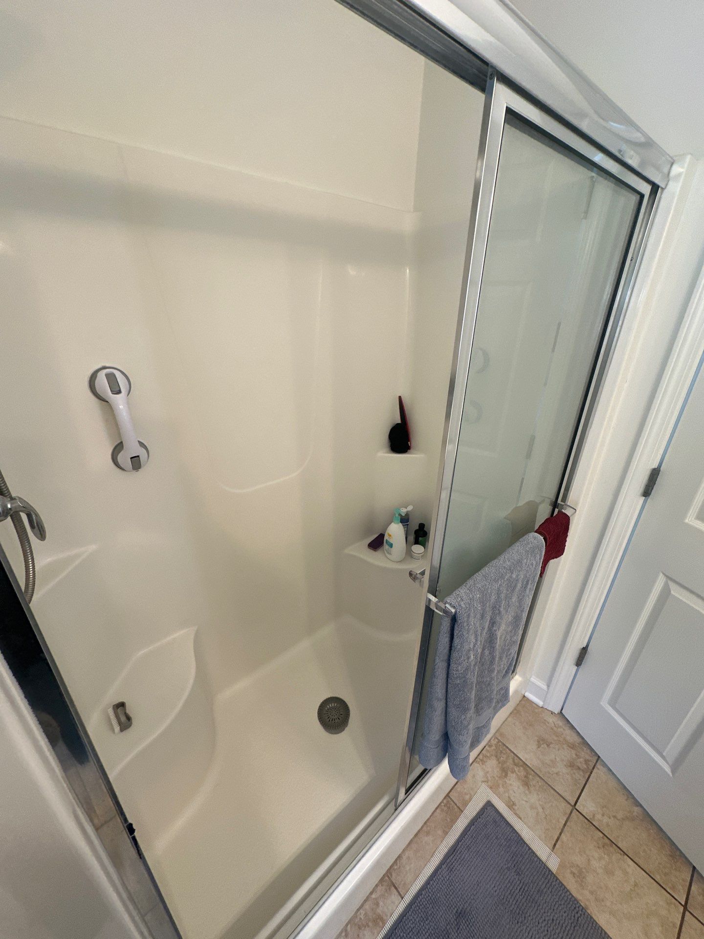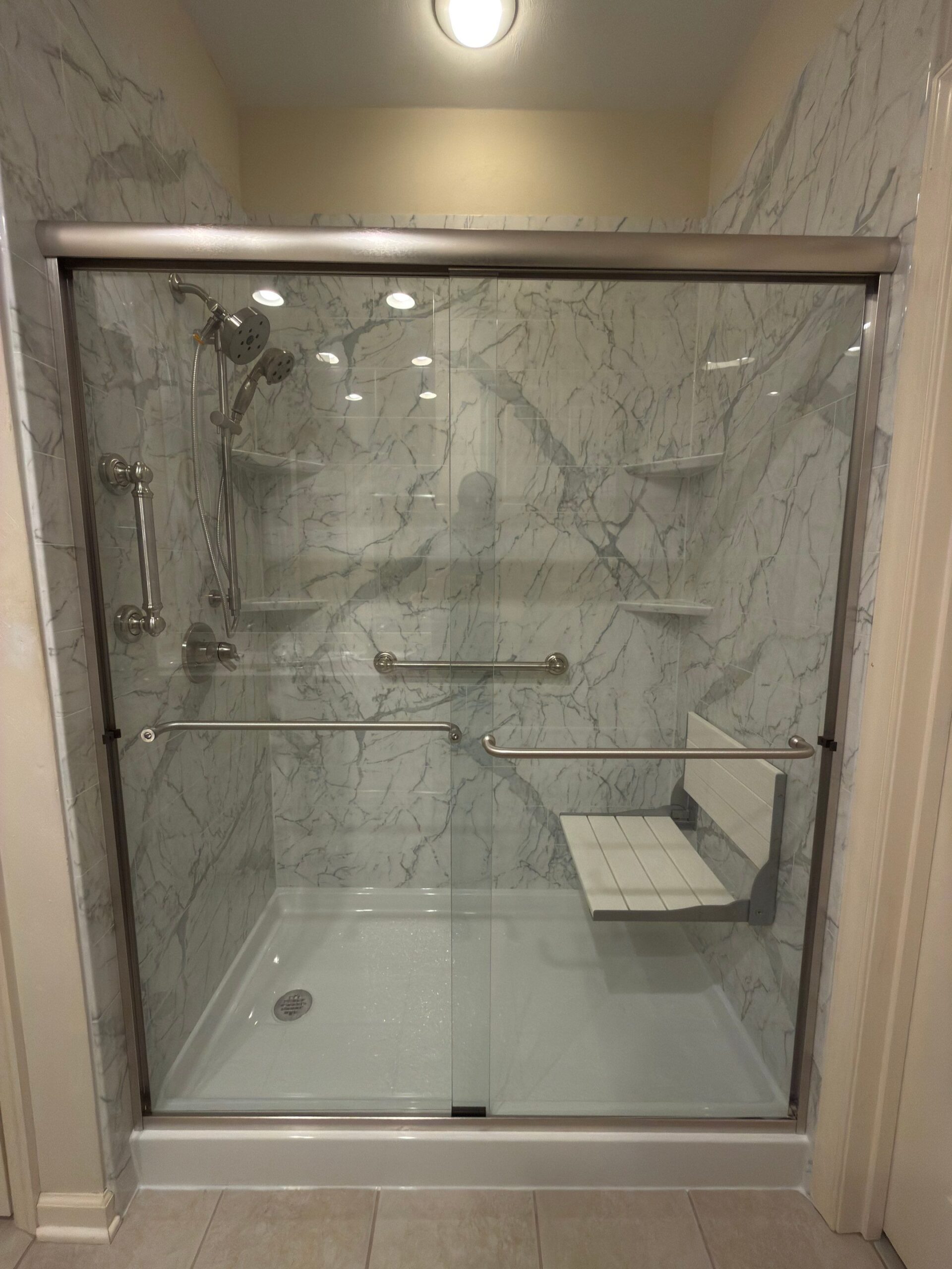 Completing the upgrade is a clear glass sliding door with a brushed nickel frame, adding a bright, open feel to the shower. The transparent design showcases the elegant interior while enhancing the overall sense of space and light.