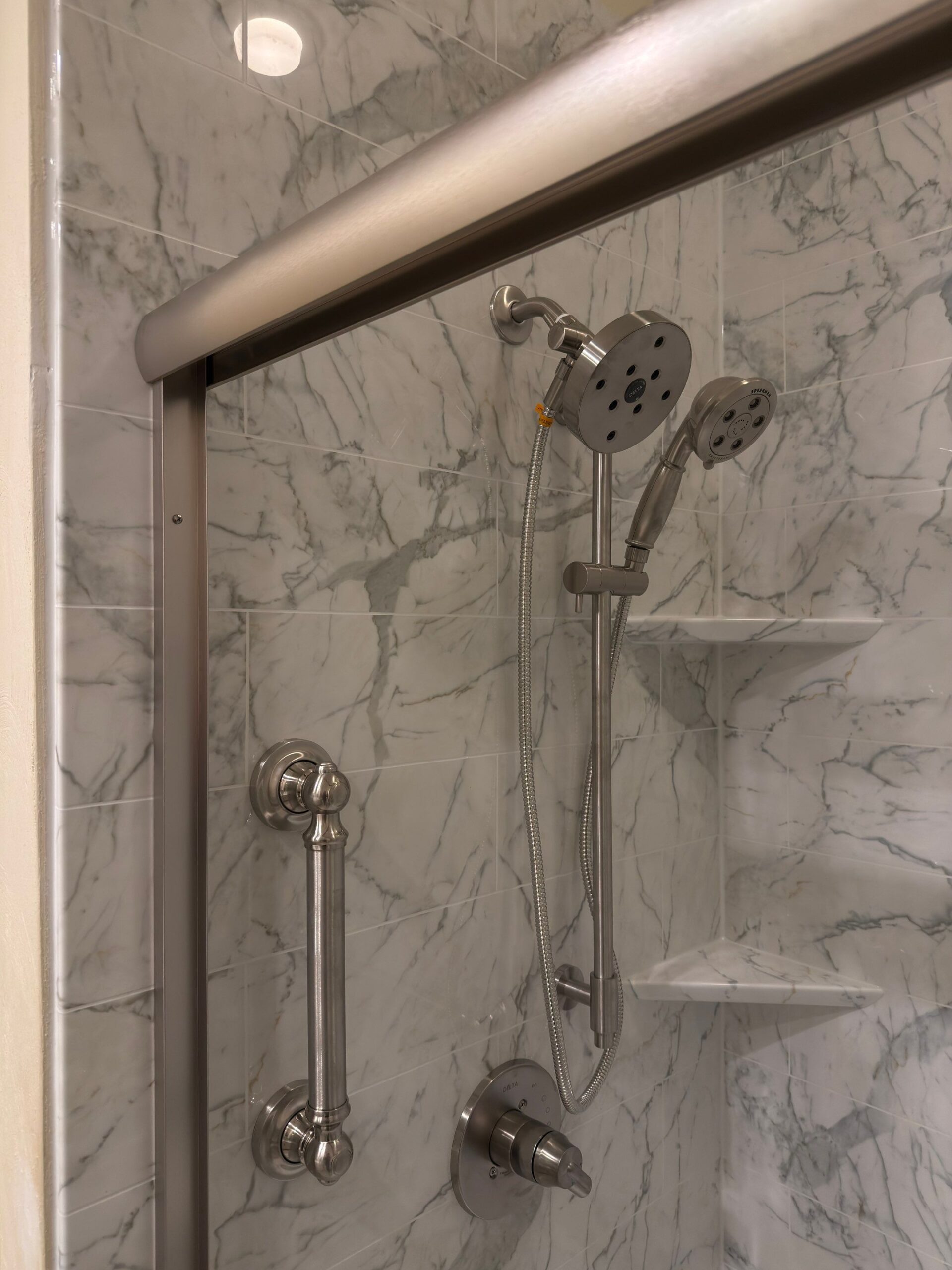 A full suite of brushed nickel fixtures brings a sleek, cohesive look to the shower. This includes a trim kit, grab bars for added safety, and a slider bar with a handheld showerhead for flexible, user-friendly functionality. Each element is thoughtfully selected to complement the galena walls and enhance both style and usability.