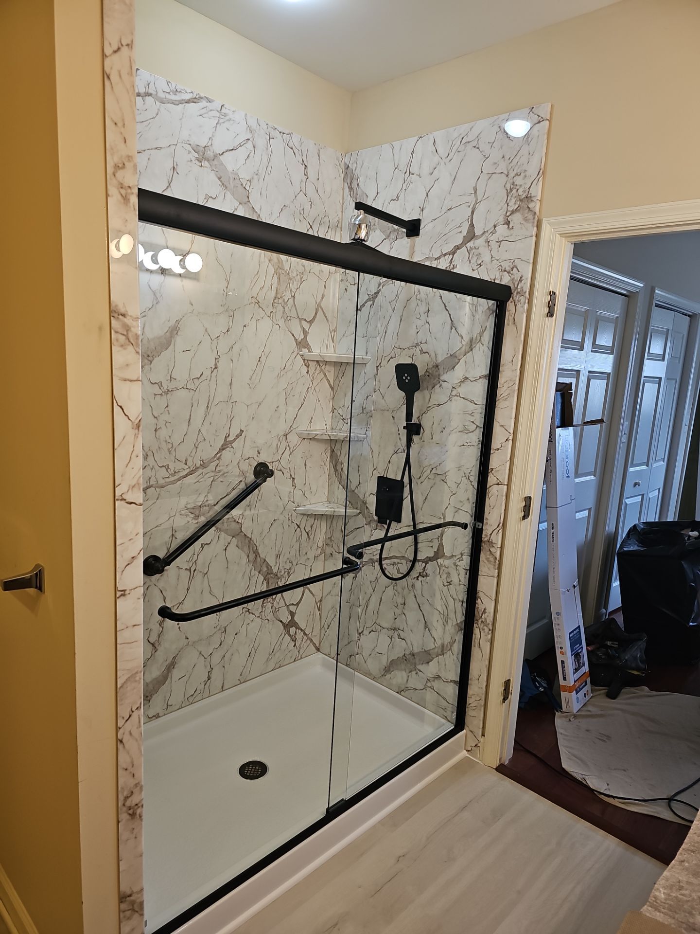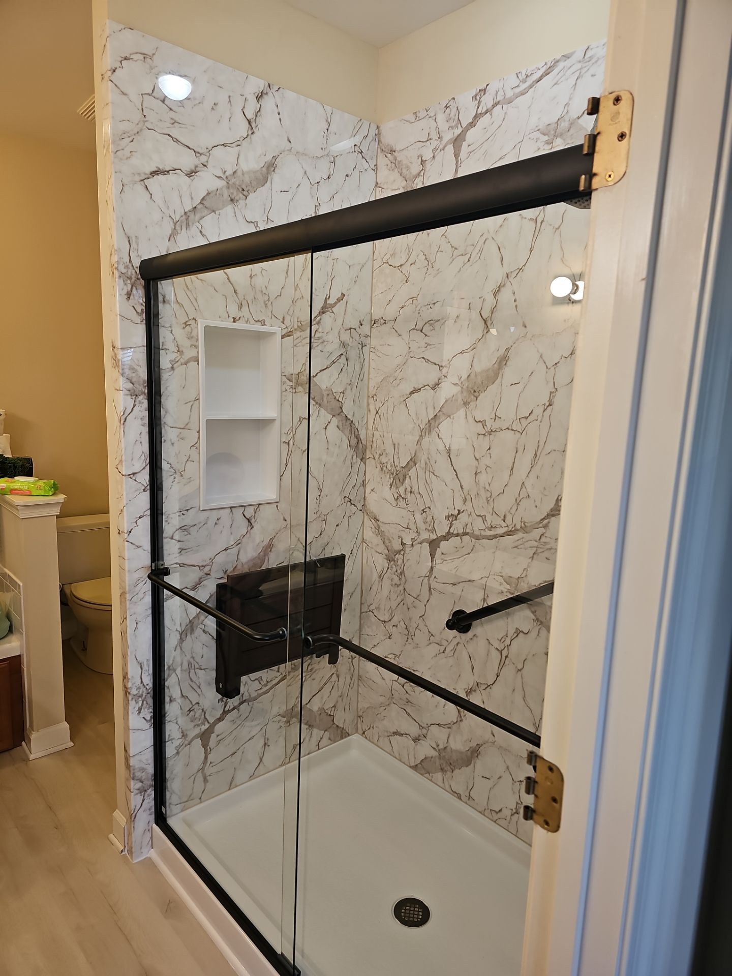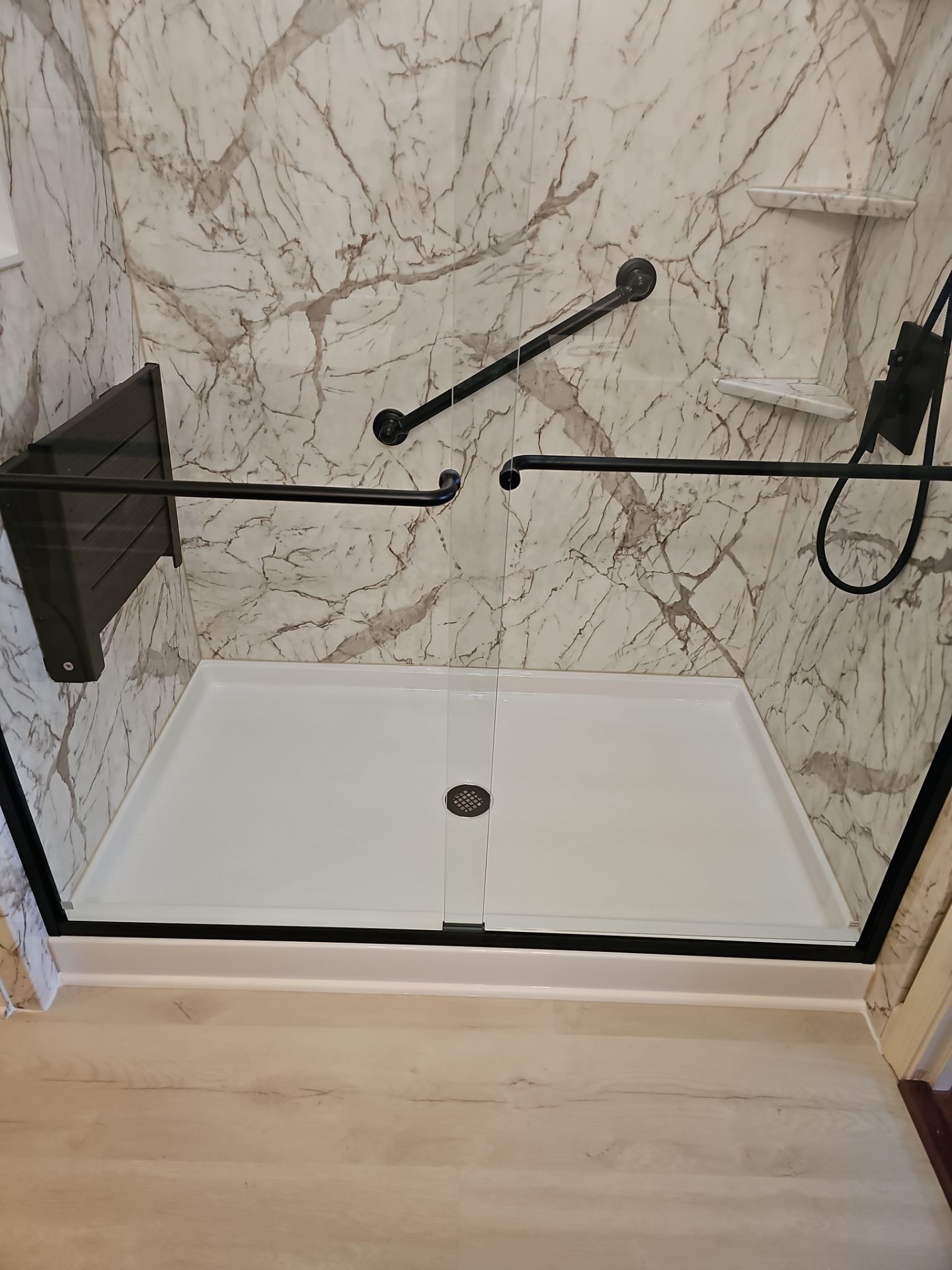 The new shower features smooth Tuscany acrylic wall panels that create a dranatic surface from floor to ceiling. Because the material is non-porous and grout-free, it actively resists moisture buildup, staining, and mildew growth. The dranatuc gray marble veins with a smooth finish adds a complimentary contrast to the simple mattte black finsh of fixtures and accessories.