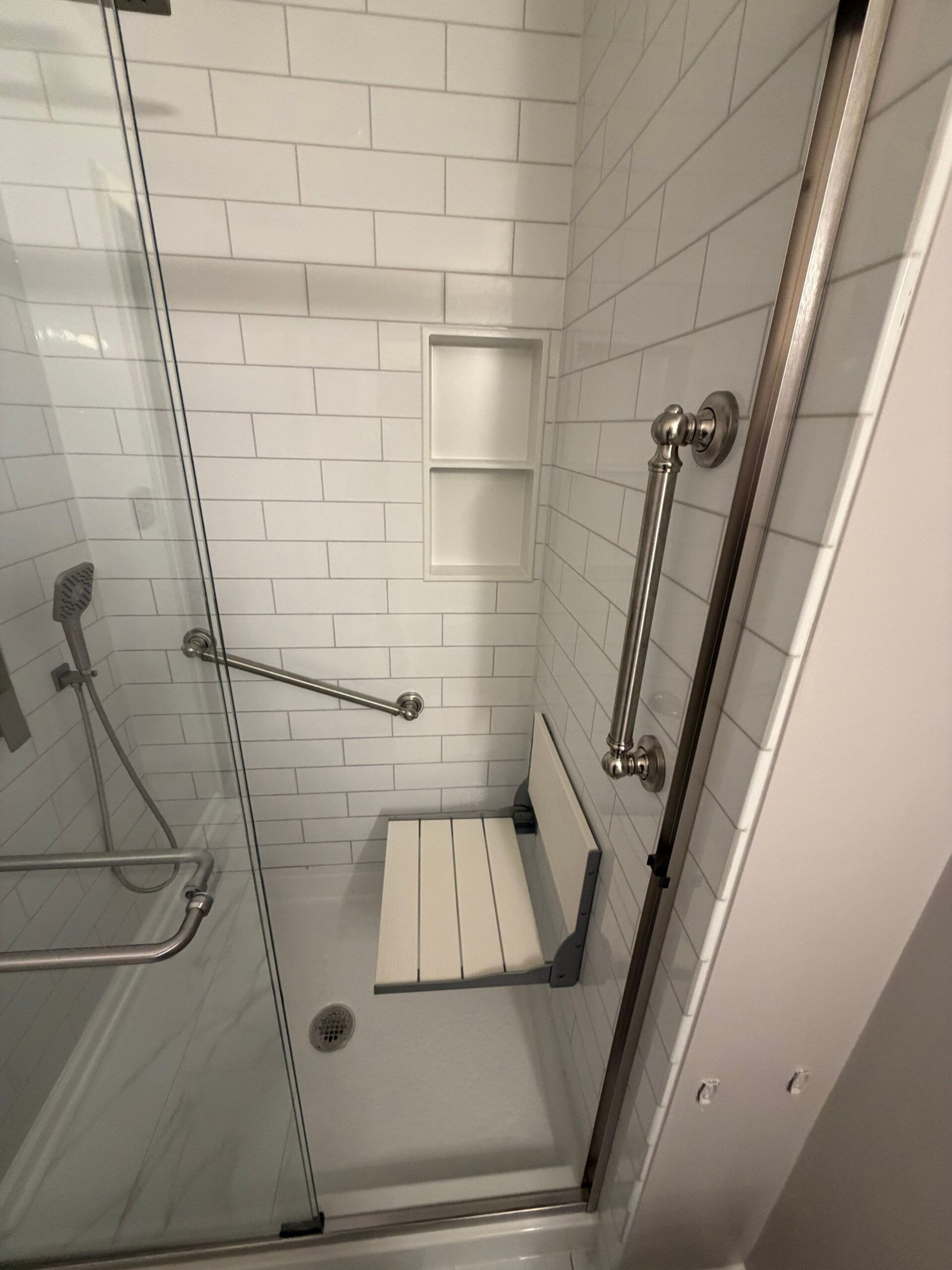 This walk-in shower was designed with long-term comfort in mind. A white composite folding seat with a brushed nickel frame offers a sturdy resting option when needed and folds away cleanly to preserve open space.