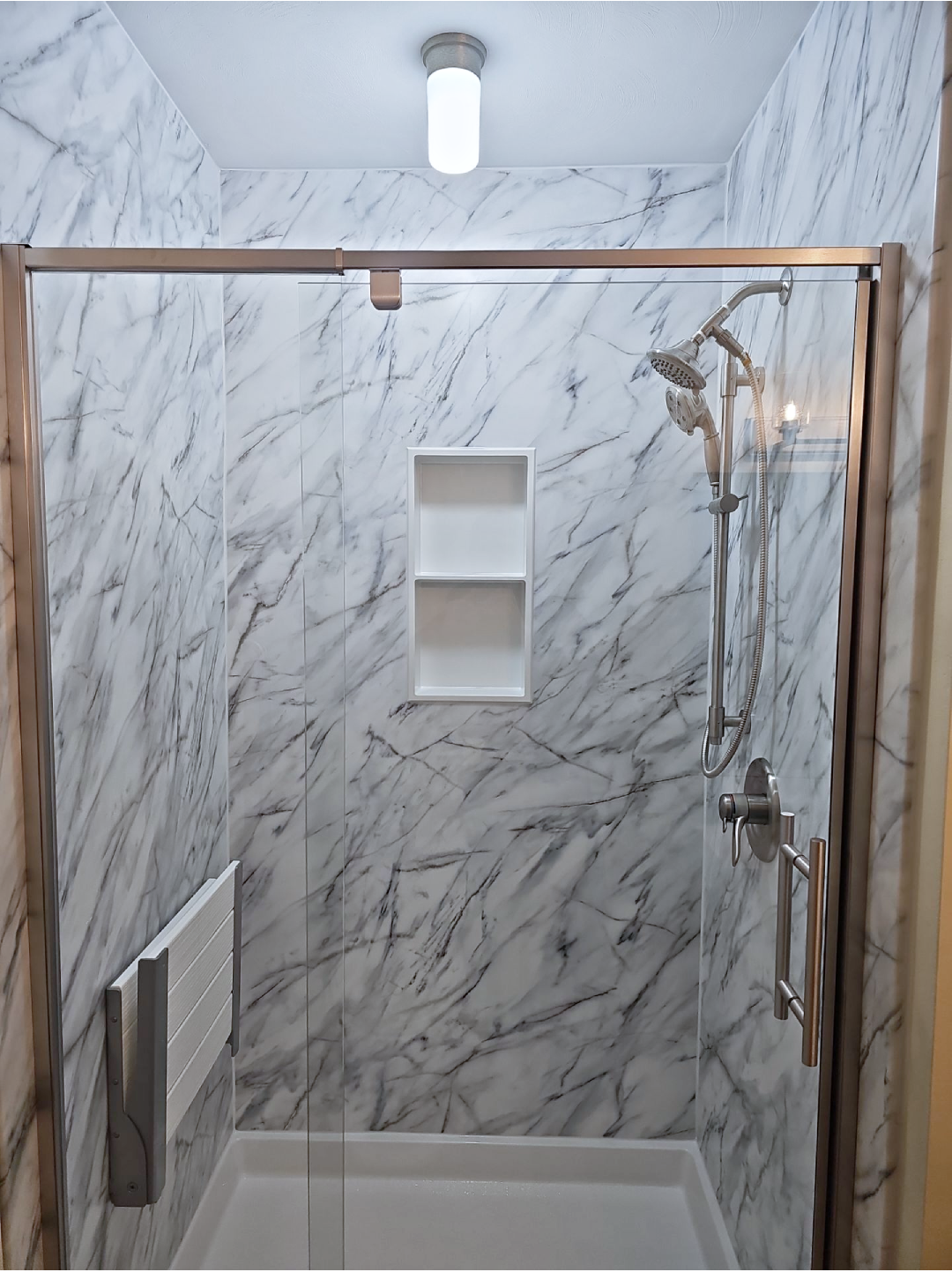 Bath Planet SW Virginia completely reimagined this bathroom to combine elegance, functionality, and safety. From the sleek acrylic Calcutta marble walls to the brand-new tub and color-matched corner shelves, every element was carefully chosen to enhance comfort, accessibility, and modern style, while matte black fixtures and strategically placed grab bars ensure both sophistication and peace of mind.