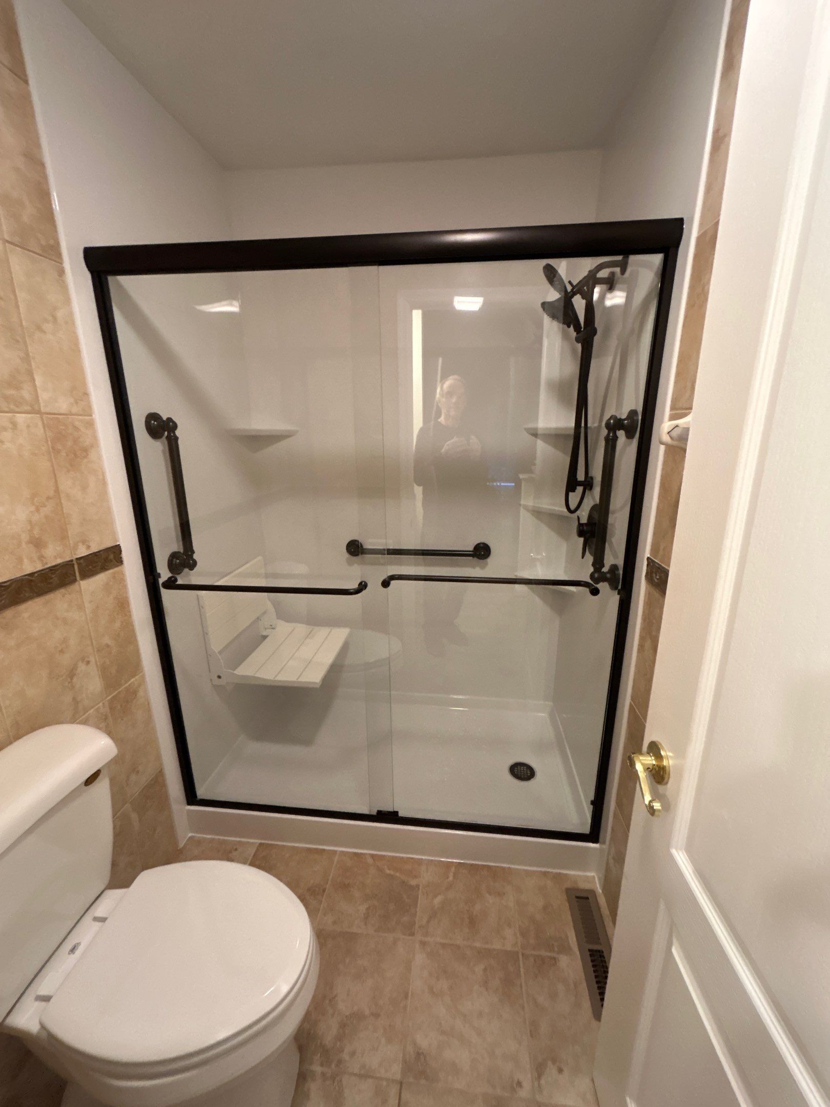 Bath Planet Southwest Virginia transformed this Forest, VA bathroom with a full shower renovation, removing the dated setup and installing a streamlined walk-in design built for easy upkeep and long-term durability. Galena wall panels provide a smooth, grout-free finish, while matte black fixtures, coordinated storage, and carefully selected comfort and safety features come together to deliver a space that feels modern, functional, and dependable for everyday living.